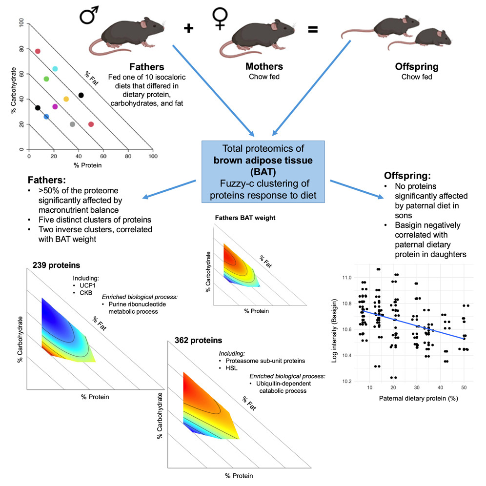 Dietary macronutrient composition in males influences brown adipose tissue (BAT) size and BAT size of daughters in C57BL/6J mice. However, the effects of macronutrients and paternal effects on BAT function have yet to be characterized. We investigated the effects of macronutrient composition on the BAT proteome in male mice and offspring. In fathers, >50% of the proteome was affected by macronutrients. We identified two clusters with inverse patterns that correlated with BAT mass. Notably, uncoupling protein 1 (UCP1) was reduced on low-fat diets that promoted increased BAT mass, while there were increased levels of proteins involved in protein turnover. The same diets also led to a reduction in proteins involved in purine biosynthesis (purines are often UCP1 inhibitors). We also found that paternal protein intake negatively affected basigin expression in daughters, a protein that regulates Ucp1 transcription. Our results show that macronutrients in males remodel the protein expression of BAT directly and in their daughters.