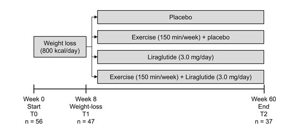 This is a substudy of men with obesity enrolled in a randomized, controlled, double-blinded trial (the S-LITE trial). The trial was conducted between August 2016 and November 2019. A total of 56 men were included in the study and assigned to an initial 8-week low-calorie diet (800 kcal/day) followed by randomization to 52 weeks of either: placebo and habitual activity (placebo), exercise training and placebo (exercise), the Glucagon Like Peptide 1 (GLP-1) analogue liraglutide and habitual activity (liraglutide) or liraglutide in combination with exercise training (combination).