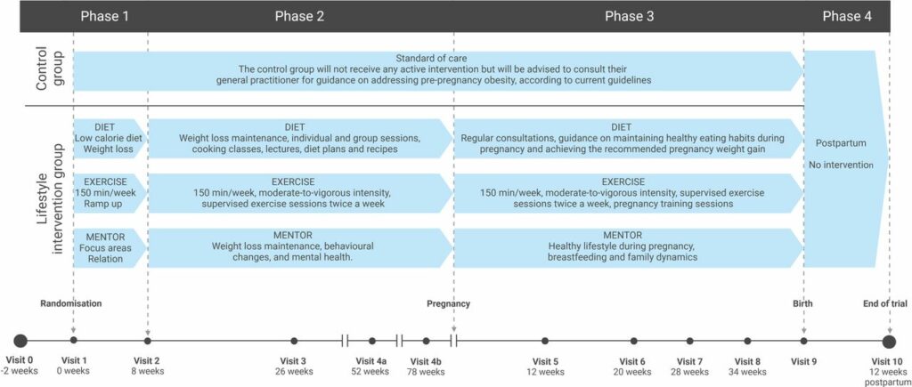 Methods and analysis: In this randomised, two-arm, parallel-group, controlled trial, we will include 360 women with overweight or obesity (aged 18-40; body mass index 25-44 kg/m2) and their partners. The women will be randomised to receive either standard of care or a lifestyle intervention focused on preconception body weight reduction, regular physical exercise, healthy diet and support from a mentor before and during pregnancy. The primary outcome is the difference in neonatal adiposity measured in their children at birth. Children conceived during the trial will constitute a birth cohort, monitoring the effects on their health until the age of 18 years.